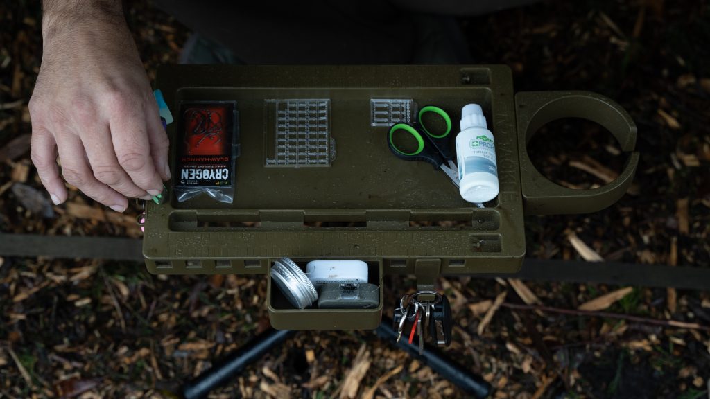 The Bankstick Organizer is the smart solution for order by the water. Features phone/tablet holder, tool and rig mounts, scale, fixing points, and versatile accessories. Includes screw-tip bankstick – organization made easy!