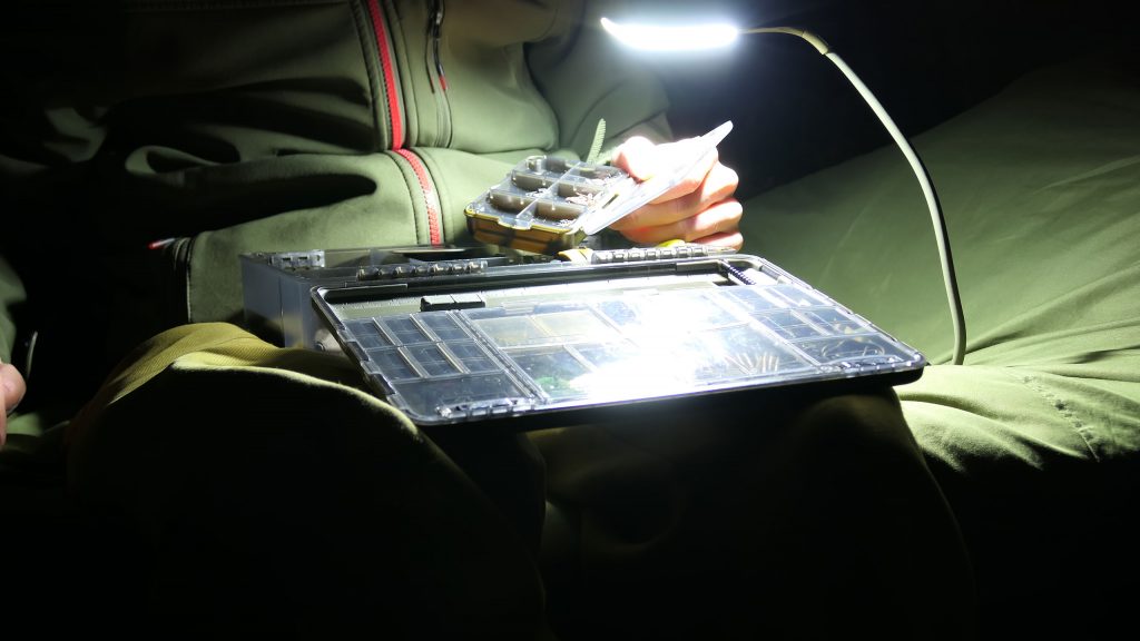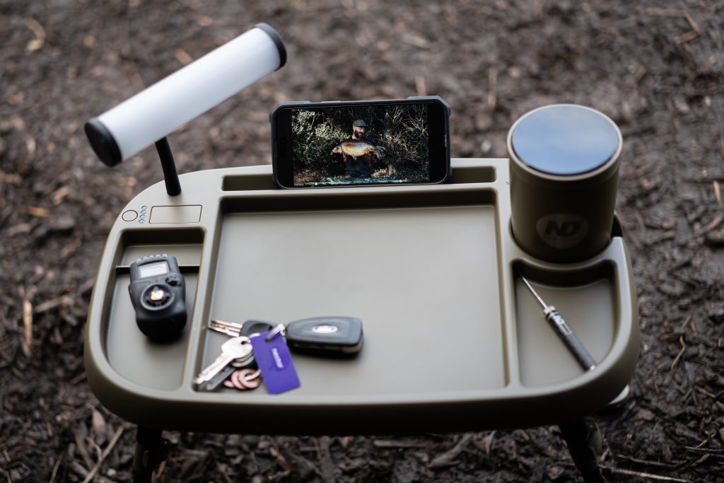 The smart Bivvy Table with optional built-in power bank, phone/tablet holder, cup holder, and magnetic parts tray. Adjustable height, durable design, and includes a carry bag – perfect organization by the water!